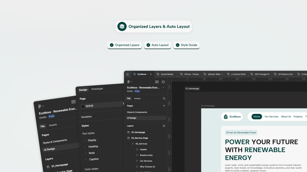Built in Figma, this kit includes 10 responsive web pages with global color styles, typography systems, and well-organized layers. Each layout is fully editable, pixel-perfect, and optimized for both desktop and mobile experiences — helping you design clean, sustainable websites faster.